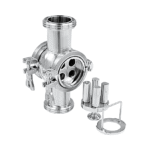 Válvula de diafragma com três portas em configuração tipo U-C, projetada para desvio, mistura ou distribuição controlada do fluxo. Seu design sanitário garante mínima retenção de produto, fácil limpeza e vedação confiável. Ideal para indústrias farmacêuticas, biotecnológicas, alimentícias e cosméticas que exigem higiene rigorosa, controle preciso e flexibilidade no direcionamento de líquidos.