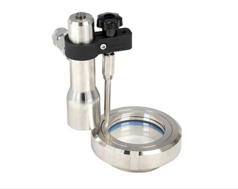 Visor de inspeção de quatro vias que permite monitorar o fluxo em múltiplas direções, oferecendo ampla visibilidade, fácil limpeza e segurança em processos sanitários e industriais.